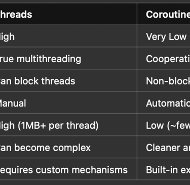 Threads and coroutines both aim to handle multiple processes efficiently, but coroutines take a modern, developer-friendly approach. They abstract away the heavy lifting, reduce boilerplate, and help you avoid common pitfalls of traditional multithreading.