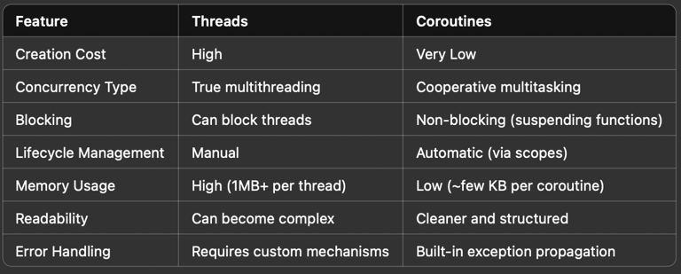 Discover the key differences between Kotlin Coroutines and Java Threads. Learn how coroutines simplify async programming, boost performance, and make your code cleaner—especially when using libraries like Retrofit.