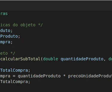 In the code above, the `CarrinhoCompras` class has three attributes: `tipoProduto`, `quantidadeProduto`, and `totalCompra`. Additionally, there is a `calcularSubTotal` method that calculates the total purchase based on the quantity of products and their unit price, determined by another method, `precoUnitario`.