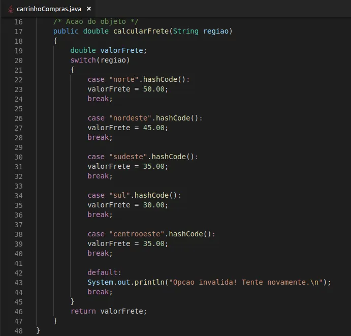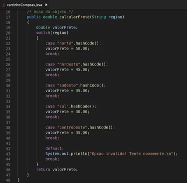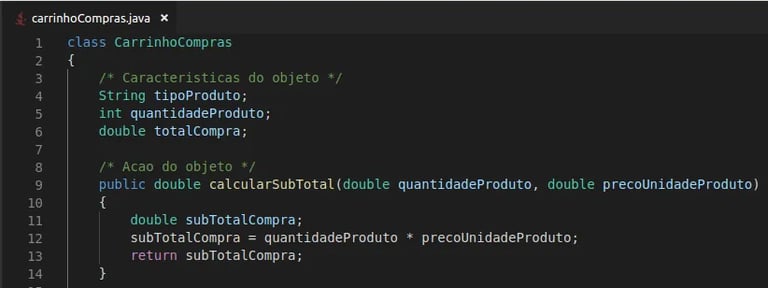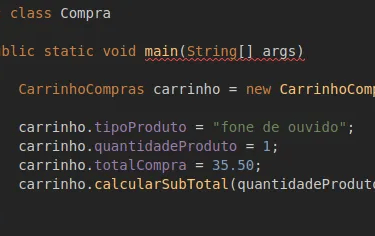 On line 54 where we write `CarrinhoCompras cart = new CarrinhoCompras();`, we are creating a new object of type `CarrinhoCompras`. After creating the object, we assign values to its variables: `tipoProduto`, `quantidadeProduto`, and then call the method `calcularSubTotal` to calculate the total value of the purchase.